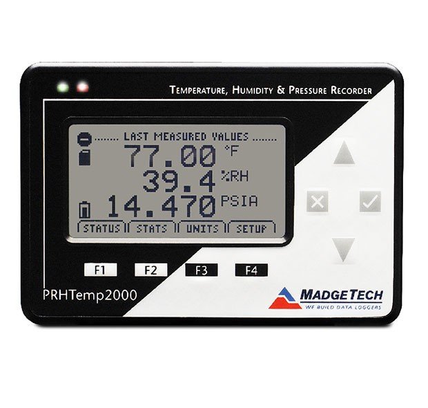The PRHTemp2000 is an all-in-one pressure, humidity, and temperature data logger with an LCD. The 8-button keypad and large LCD provide convenient access to current data and data logger setup. Additionally, memory and battery levels, external power status, sampling and recording status are shown on the LCD.