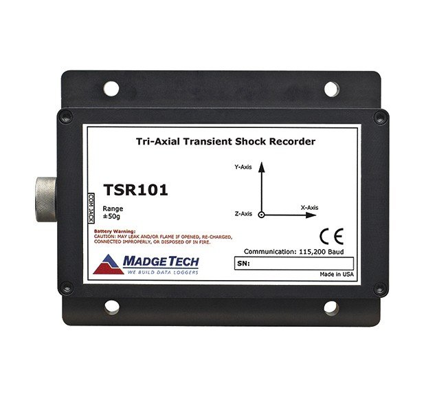 The TSR101 is a battery powered, stand alone, tri-axial shock data logger. The TSR101 measures and records data of instantaneous shock levels when the user-selectable shock levels have been exceeded. There are 15 reading rates to choose from ranging from 1024Hz to 1 Hz. The TSR101 is valuable in characterizing environments such as packaging & fragility assessment (drop testing), break & crash testing, and shipping validation.
